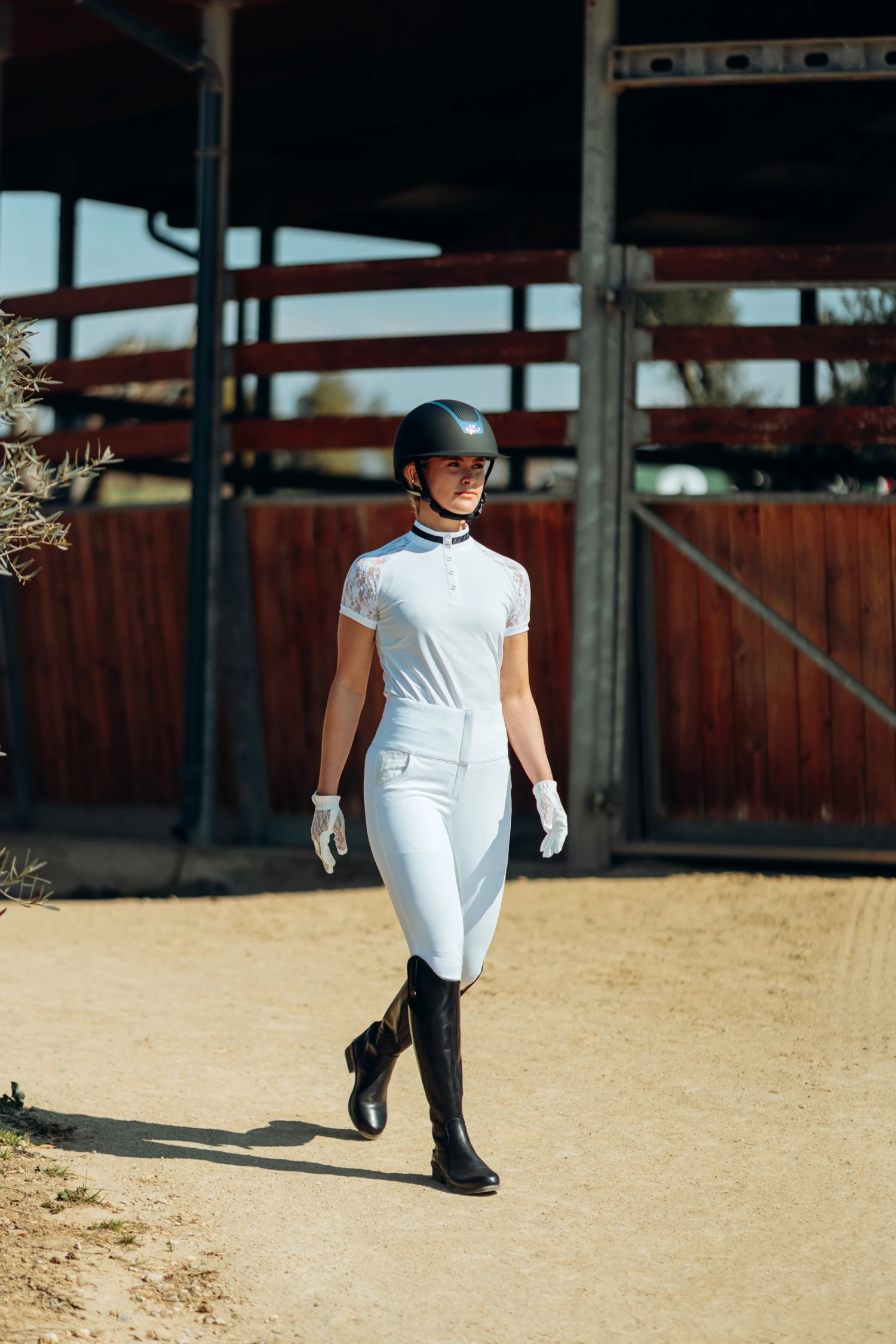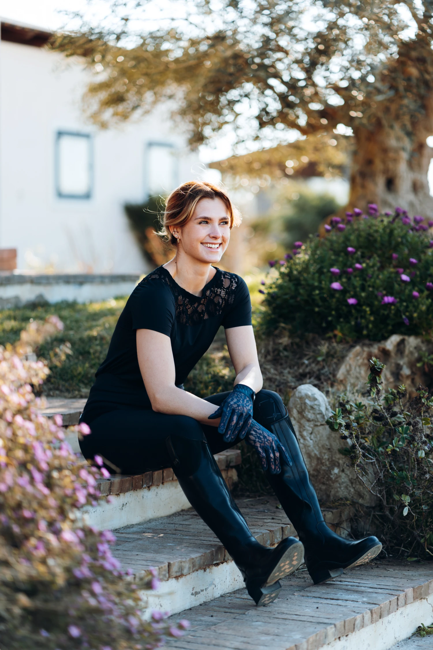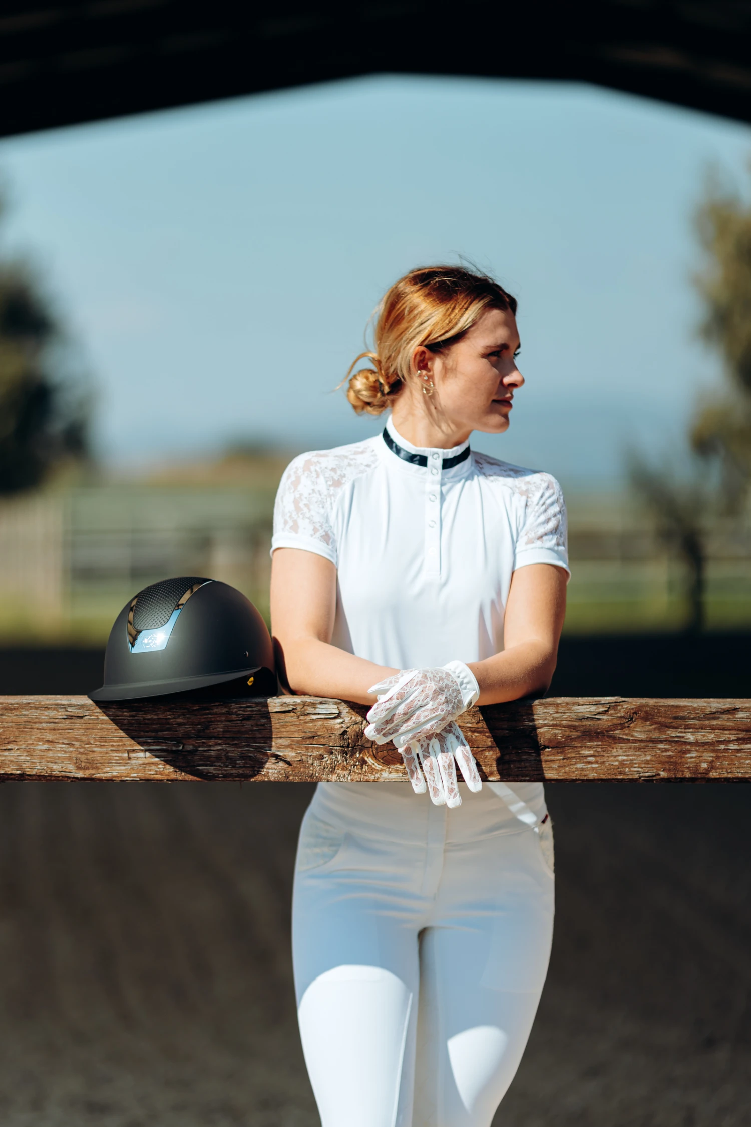 Die B Vertigo Reithandschuhe sind mit feiner, atmungsaktiver Spitze auf dem Handrücken verziert. Elastisches Kunstleder auf der Handinnenseite sorgt für guten Grip. Der verstellbare Riemen kann für den perfekten Sitz angepasst werden.