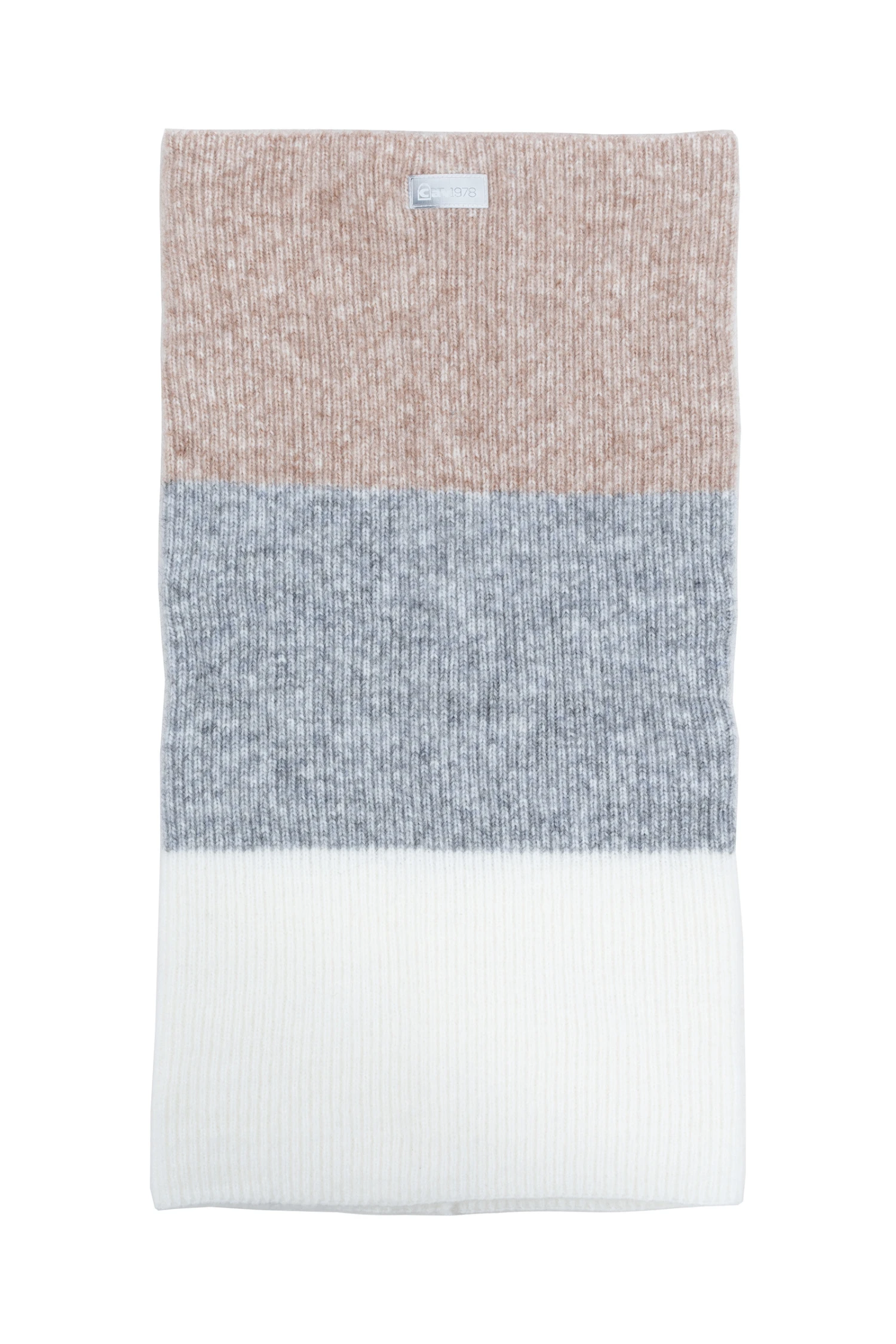 Kuscheliger Strickloop mit Blockstreifen. Blockstreifen in zarten Farben gehalten. Holographisches Cavallo Logo Patch in der oberen Mitte.