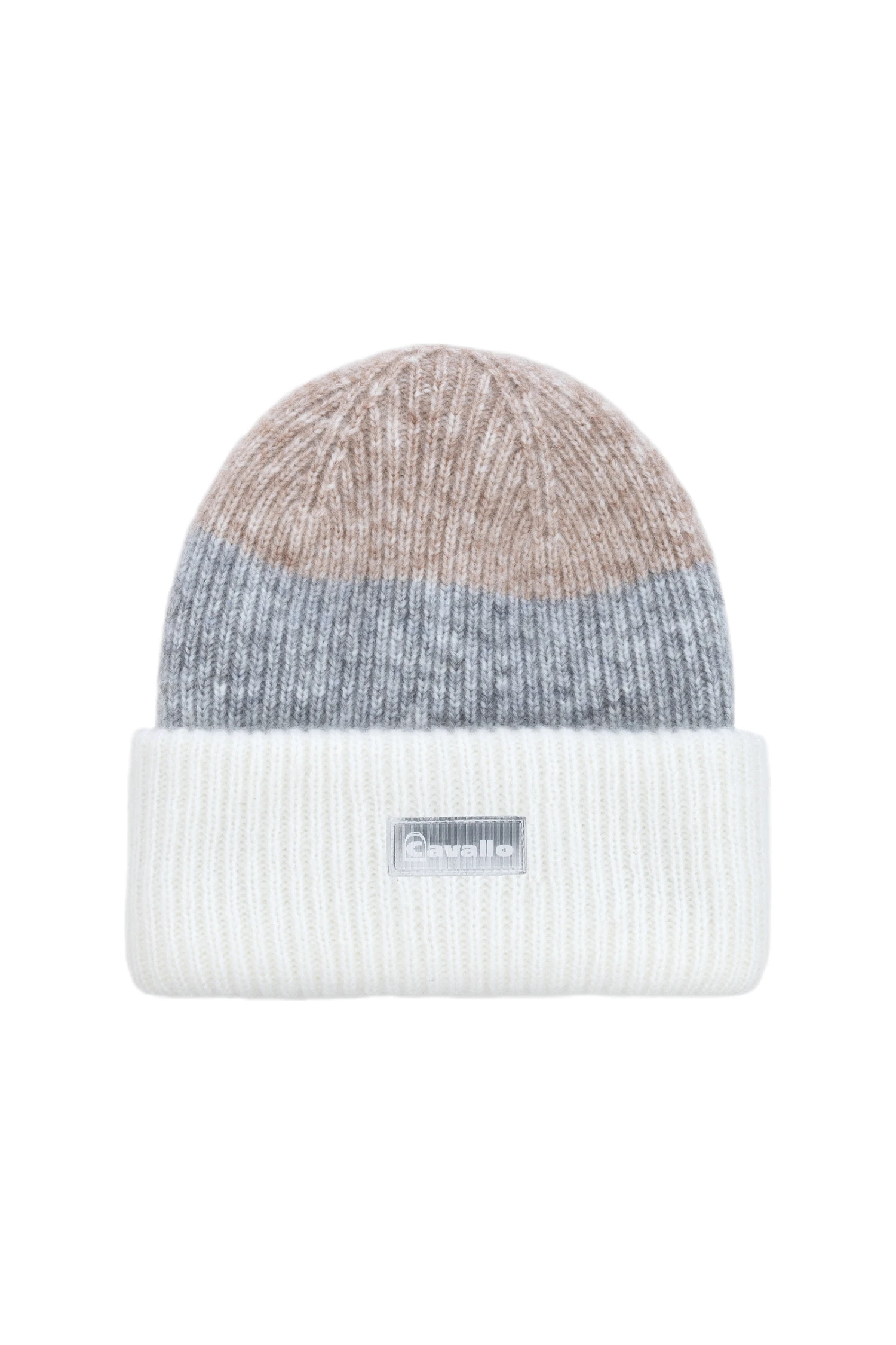Kuschelige Strickmütze mit Blockstreifen. Blockstreifen in zarten Farben gehalten. Holographisches Cavallo Logo Patch mittig auf der Krempe.