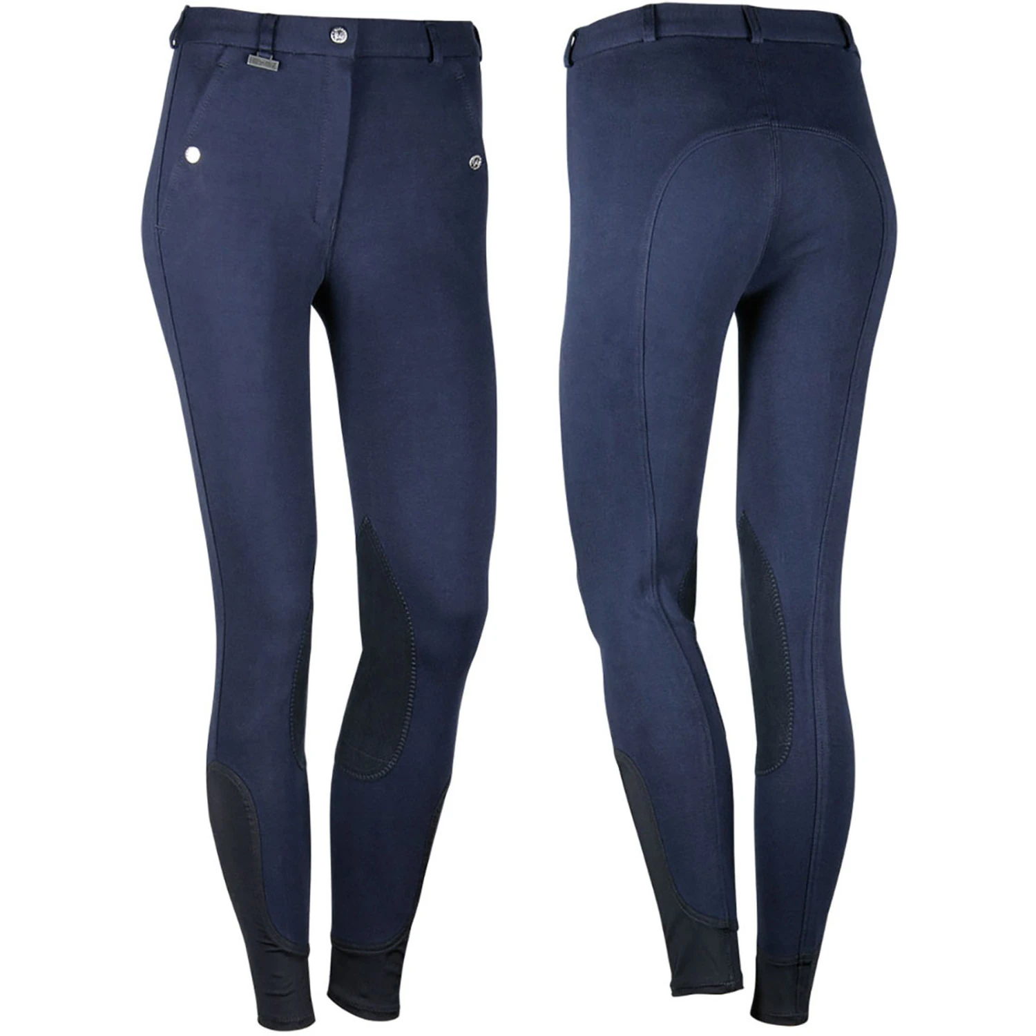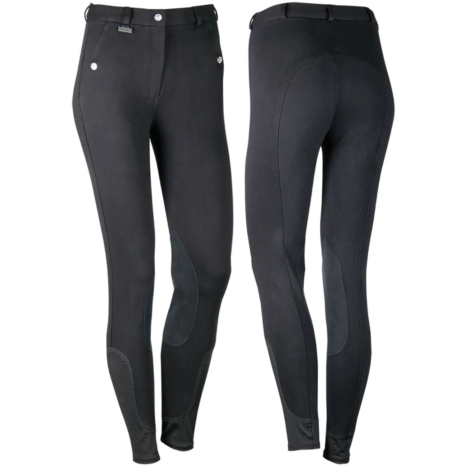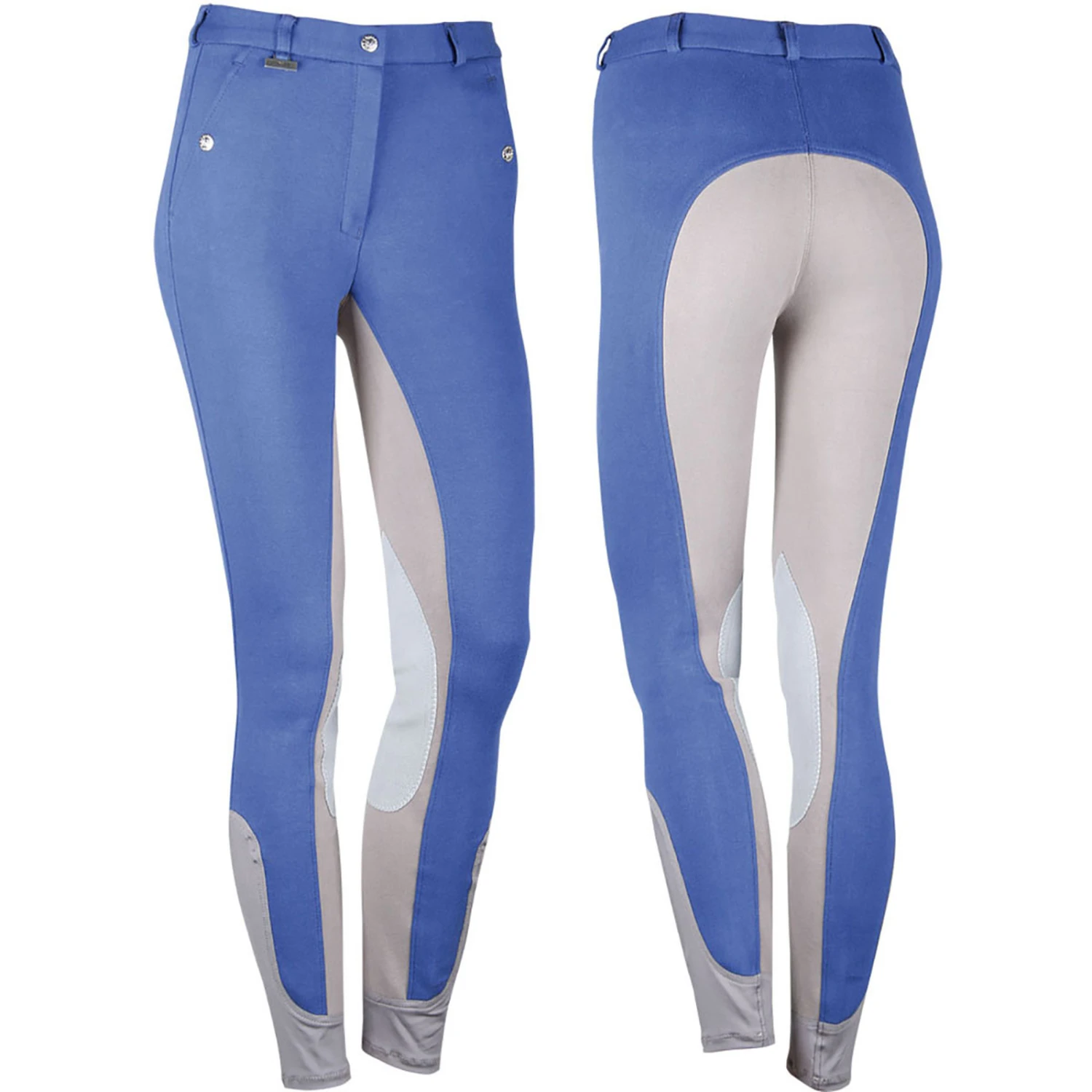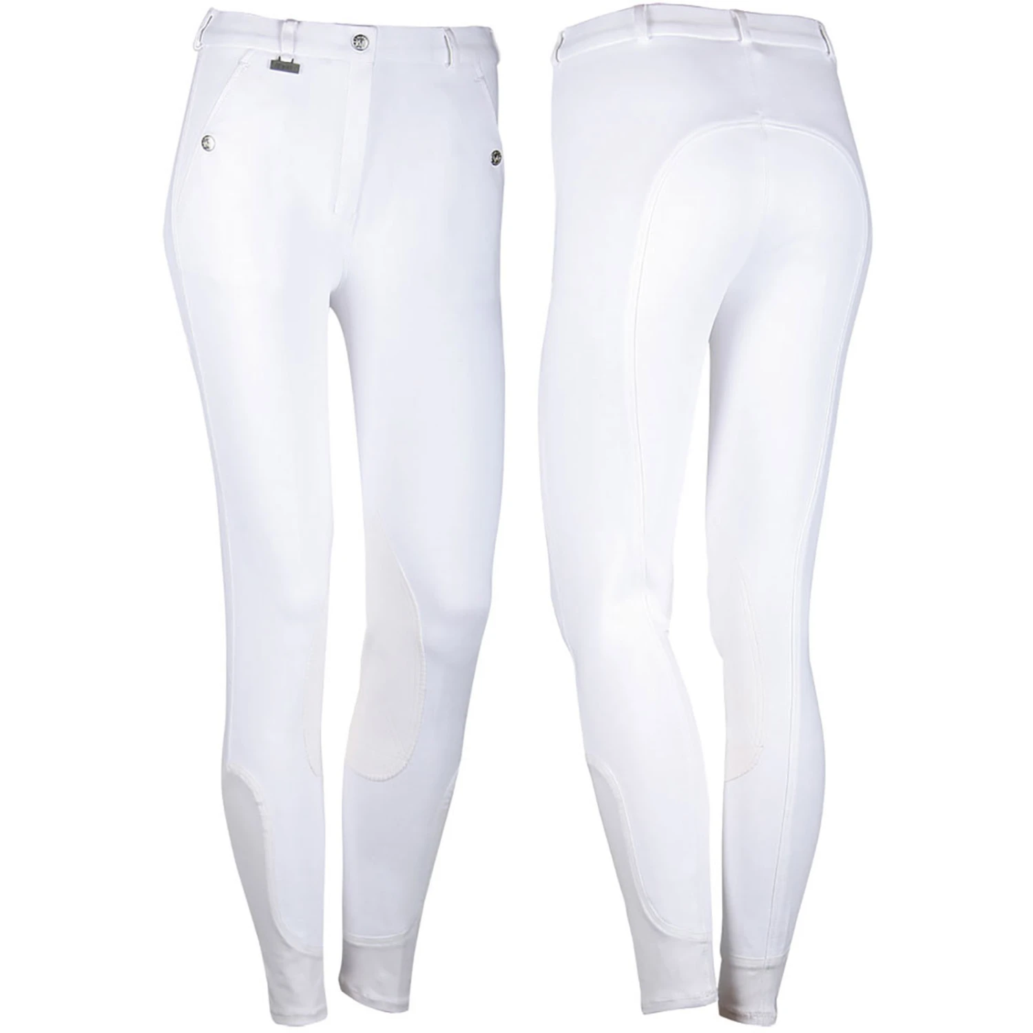 Reithose mit Schiebeverschluss, Reißverschluss, Druckknopftaschen, Gürtelschlaufen und elastischem Beinabschluss aus Lycra.