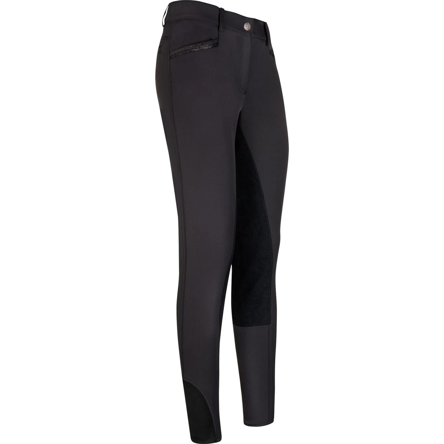 Ausgefallene Reithose mit Glitzerfoliendruck-Details an Vorder- und Gesäßtaschen sowie an den hinteren Gürtelschlaufen. Strasssteine entlang der Vorder- und Gesäßtasche. Logo-Glitzerfoliendruck auf dem Vorderbein. Mit Vollbesatz.